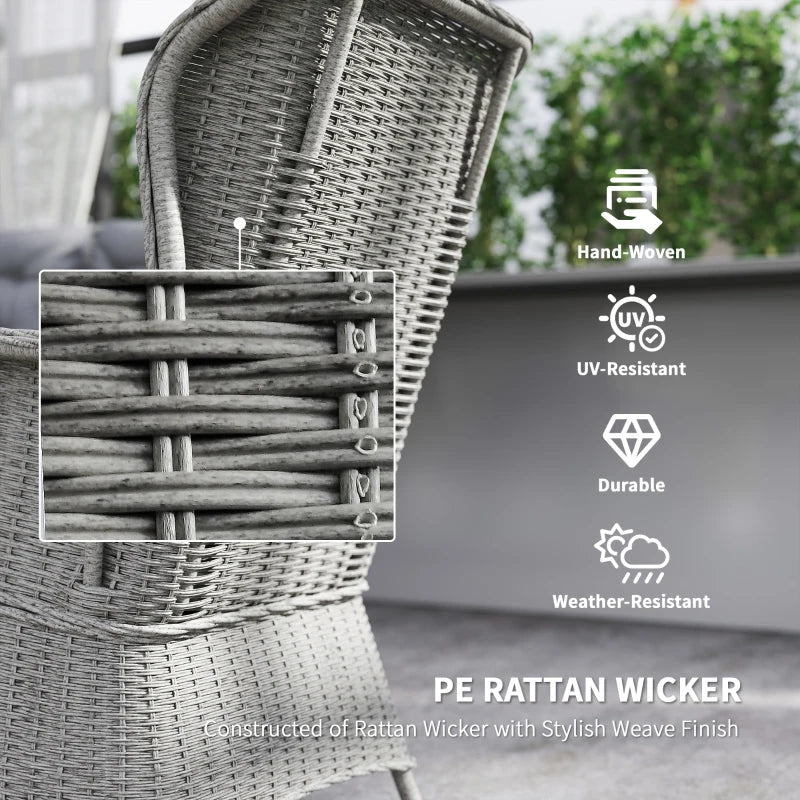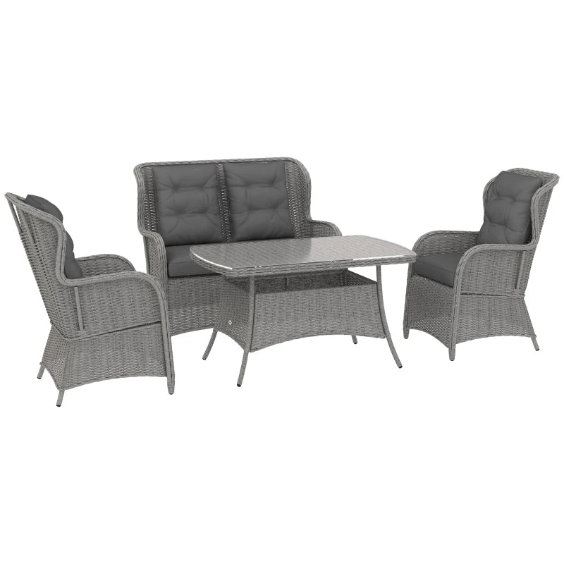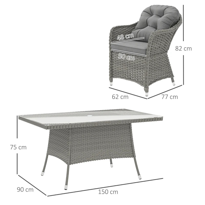 Outsunny Rattan Garden Furniture Set, Outdoor Dining Table and Chairs 4 Seater with Cushions, Square Tempered Glass Top, 4 Armchairs, for Balcony, Terrace, Conservatory, Grey