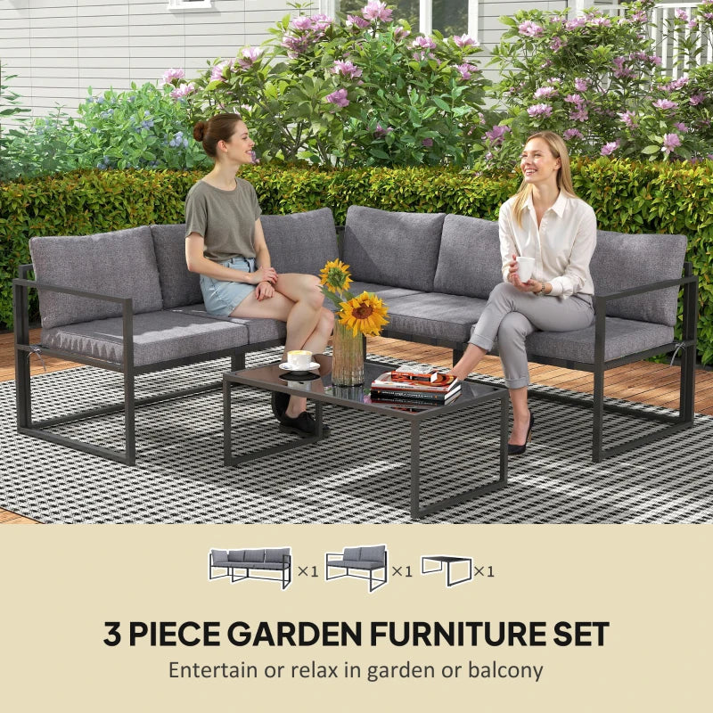 Outsunny 4 Piece L-shaped Garden Furniture Set 8-Seater Aluminium Outdoor Dining Set Conversation Sofa Set w/ Bench, Dining Table & Cushions, Grey