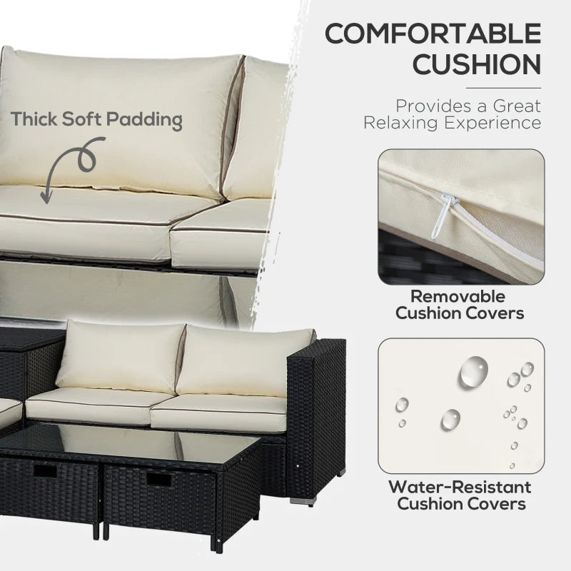 Outsunny 4 Pieces Rattan Garden Furniture Set, 4 Seater Corner Sofa Set with Storage Box, 2 Drawers Coffee Table, Loveseats with Cushions, Wicker Garden Conservatory Furniture for Balcony, Black