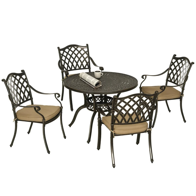 Outsunny 4 Seater Outdoor Dining Set Antique Cast Aluminium Garden Furniture Set with Cushions Round Dining Table with Parasol Hole, Bronze