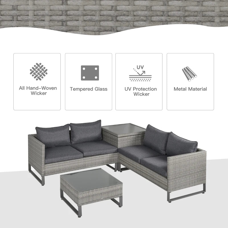 Outsunny 4 Pieces Rattan Garden Furniture Set, 4 Seater Garden Sofa Set with Storage Box, Loveseats and Glass Top Table, Wicker Outdoor Conservatory Furniture with Cushions for Outdoor, Patio, Grey