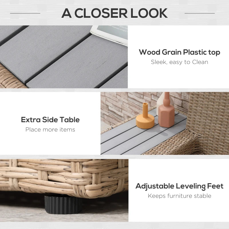 Outsunny 4 Pieces Rattan Garden Furniture Set, Garden Corner Sofa with Side Trays, Wicker Conservatory Furniture Set with Loveseats, Slatted Plastic Top Coffee Table and Cushions, Beige