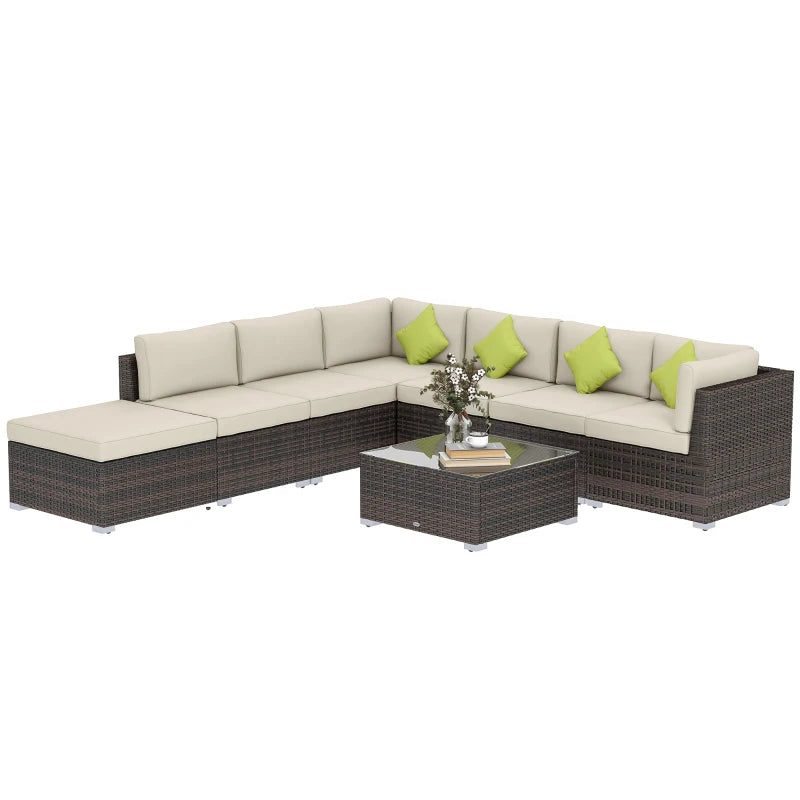 Outsunny 8 Piece Rattan Corner Sofa Set with Wide & Deep Seat, Assembled Aluminium PE Rattan Garden Furniture Set with Thick Cushions and Glass Top Table for Outdoor, Conservatory, Mixed Brown