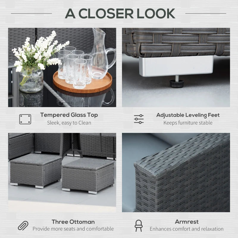 Outsunny 8 Pieces Rattan Garden Furniture Set, Garden Corner Sofa Set with 4 Chairs, 2 Footstools, 2 Coffee Tables and Cushions, Space-Saving Design, No Assembly Required, Grey
