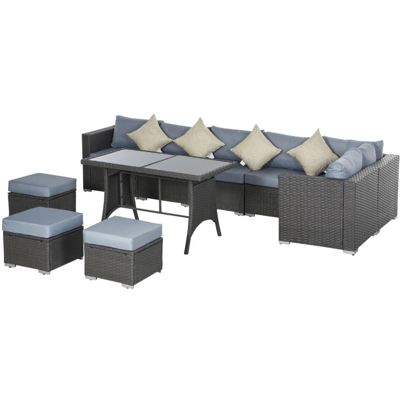 Outsunny 9-Seater Garden Rattan Furniture 10 Pcs Rattan Corner Dining Sofa Set, Grey/Dusty Blue Cushion