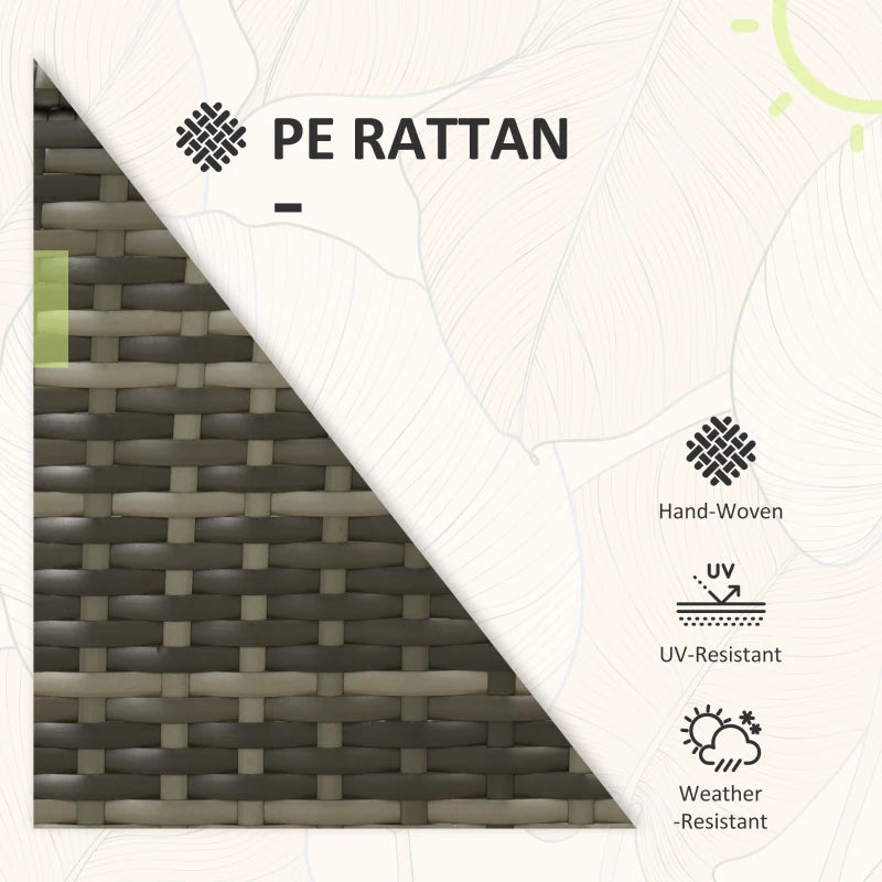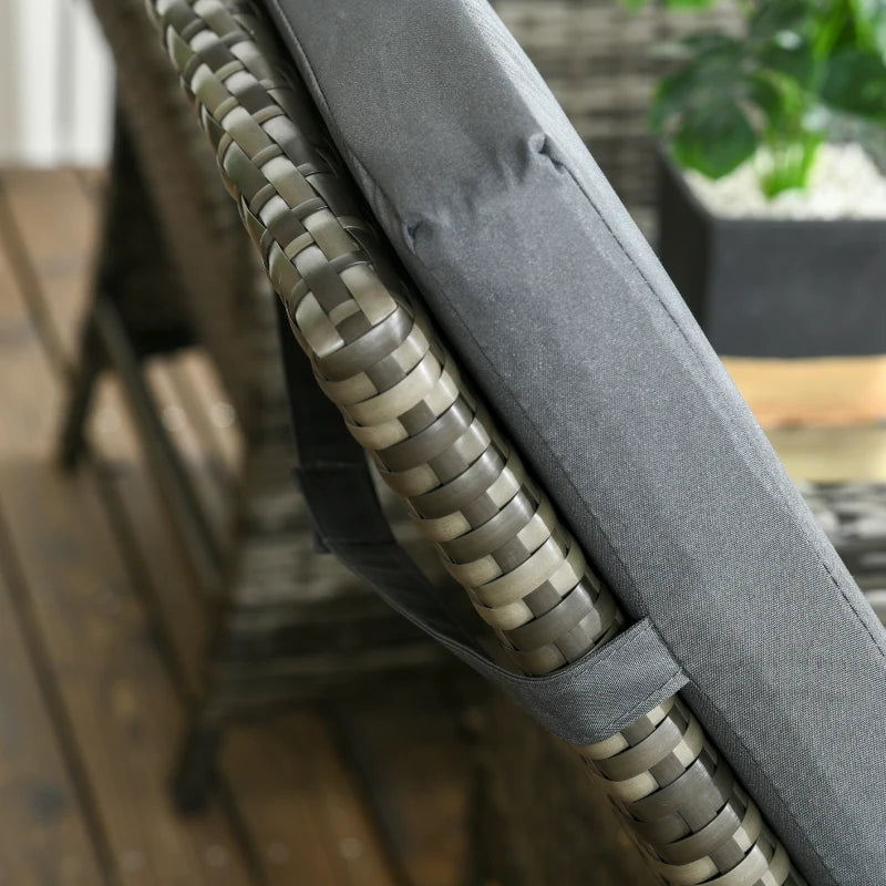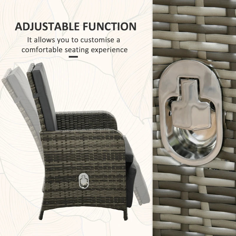 Revitalise your outdoors with this Outsunny rattan garden bistro set. This three-piece patio set comes with two reclining garden chairs and a middle table: relax with company. Adjust the backs and footrests to a position you want. The cushions on this small rattan garden furniture set, from top to bottom, are super comfortable: sink in all day long. Complete with non-slip feet to gently protect the floor.