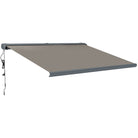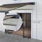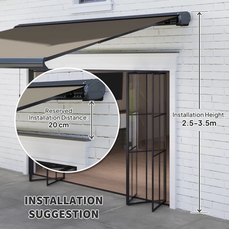 Discover the ease of shade with the Outsunny retractable awning. Control sunlight with a touch of a remote or a simple turn of the hand crank. Its fully closed cassette design keeps the elements out. Enjoy UPF 50+ protection under a robust awning canopy, great for any garden or window setup. Can be mounted on concrete or solid brick walls. The wall needs to be 2.5-3.5 m high to fit the awning. Leave 20cm clearance when mounting above door or window.