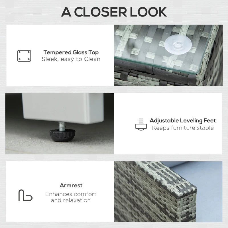 This Outsunny rattan furniture set allows you to rest and relax outdoors. Rust-resistant steel frames make strong pieces, with plastic wicker for a beautiful and tough rattan look. Seat and back cushions on the rattan corner sofa for comfort. Tempered glass tabletop for a sleek look - easy to maintain.