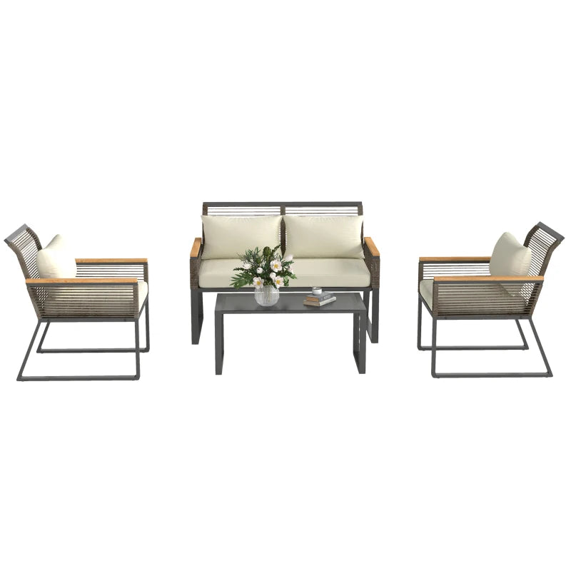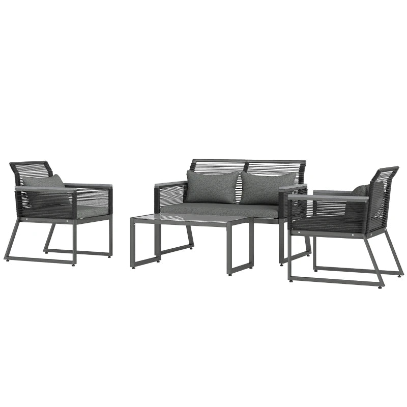 Outsunny Four Piece Wicker Rope Garden Furniture Set with Glass Top Coffee Table - Grey