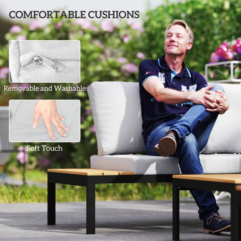 Outsunny Four-Piece Garden Corner Sofa Set with 2 Loveseats and 2 Coffee Tables - Teak
