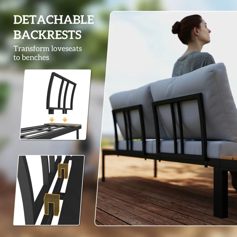 Outsunny 5 Seater Garden Corner Sofa Set, 4 Pieces Metal Garden Furniture Set with Loveseats, Glass Top Coffee Table, Breathable Mesh Pocket, Outdoor Conversation Furniture with Cushions, Light Grey