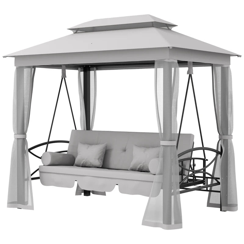 Outsunny 3 Seater Convertible Swing Chair, Outdoor Gazebo Swing Seat Bed with Double Tier Canopy, Cushioned Seat, Mesh Sidewalls, Light Grey
