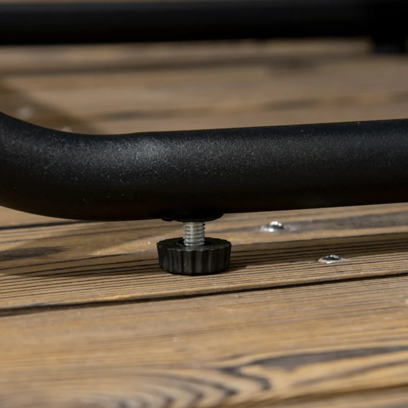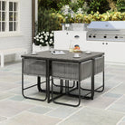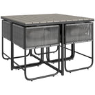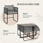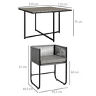 An inviting setting for all great for garden and other outdoor areas: this Outsunny five-piece garden set. It comes with four armchairs and a square dining table - room for you to sit down and gather round together. Solid metal for a strong frame, with plastic wicker for the chairs to offer double the durability; the fringed design creates a very cool look. The wood-effect plastic tabletop is tough and easy to clean. Both chairs and stools come with padded cushions for comfort.