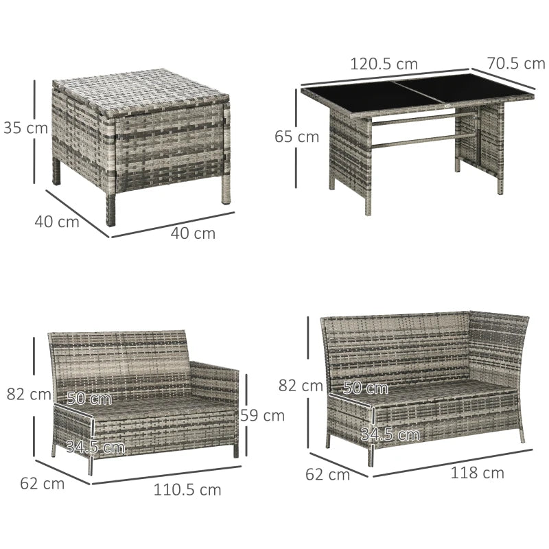 Bring some serious style into your outdoors with this outdoor corner sofa set from Outsunny. The conservatory furniture comes with two two-seater sofas, a corner chair, two footstools and a double table.The rust-resistant metal frame ensures a tough and strong core, with UV and fade resistant PE rattan wrapped around, offering double the protection and durability. The garden furniture sets are finished with sleek cream cushions all over, making this set great to have in your space too.