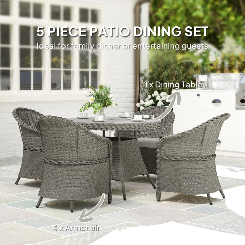 Outsunny 4 Seater Rattan Garden Furniture Set with Cushions, Round PE Rattan Dining Set with Glass-Top Table, Umbrella Hole, Outdoor Garden Table and Chairs, Grey