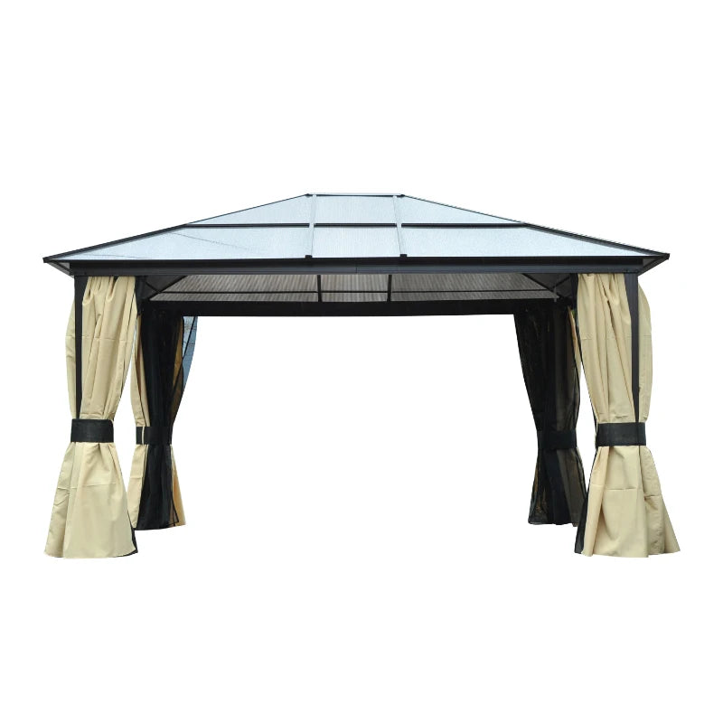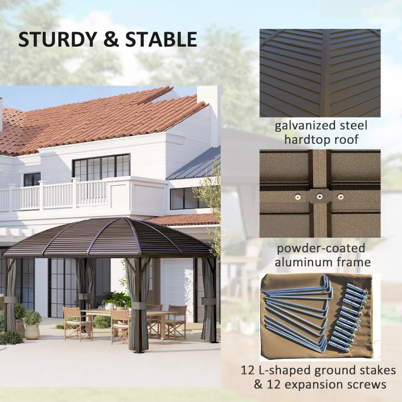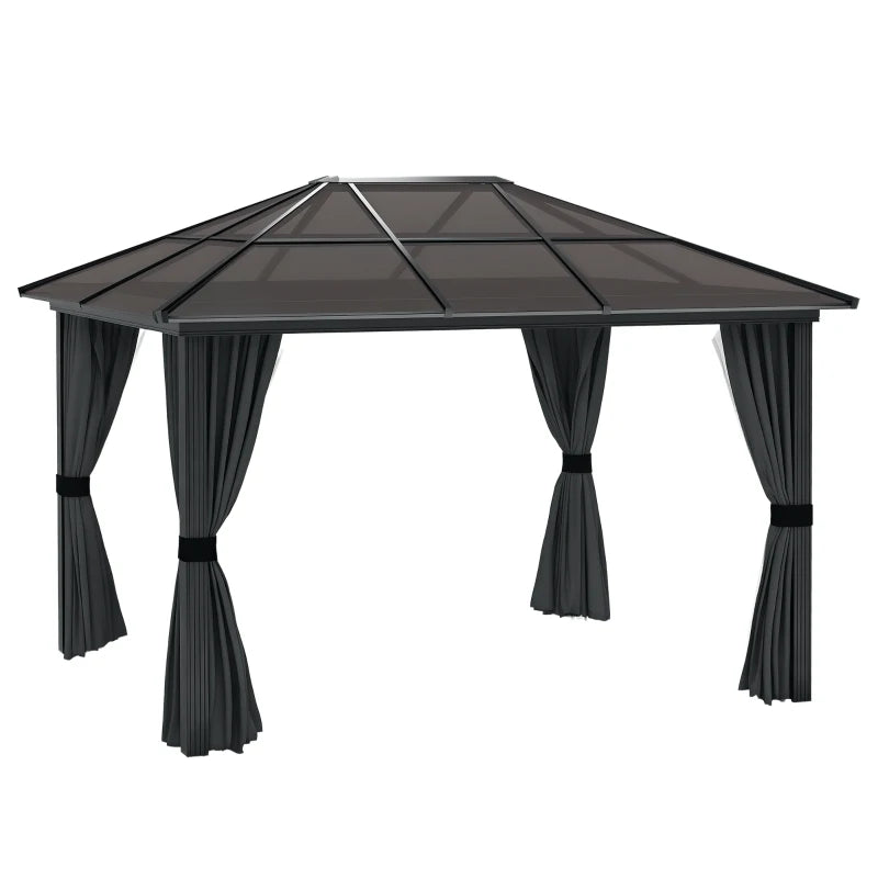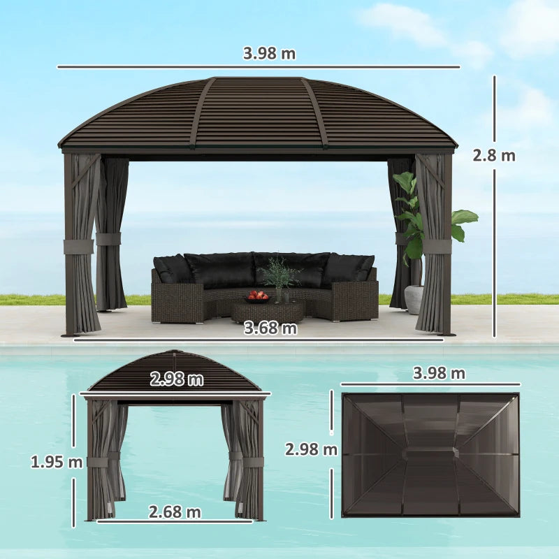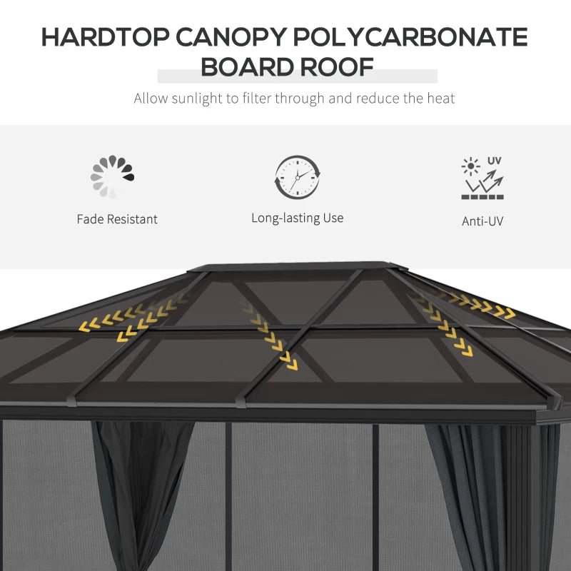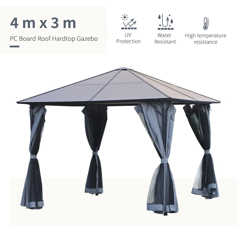 Outsunny 3.6 x 4m Hardtop Gazebo Canopy with Polycarbonate Roof and Aluminium Frame, Garden Pavilion with Mosquito Netting and Curtains