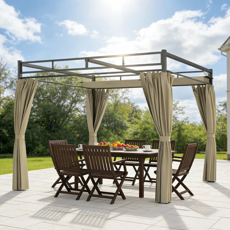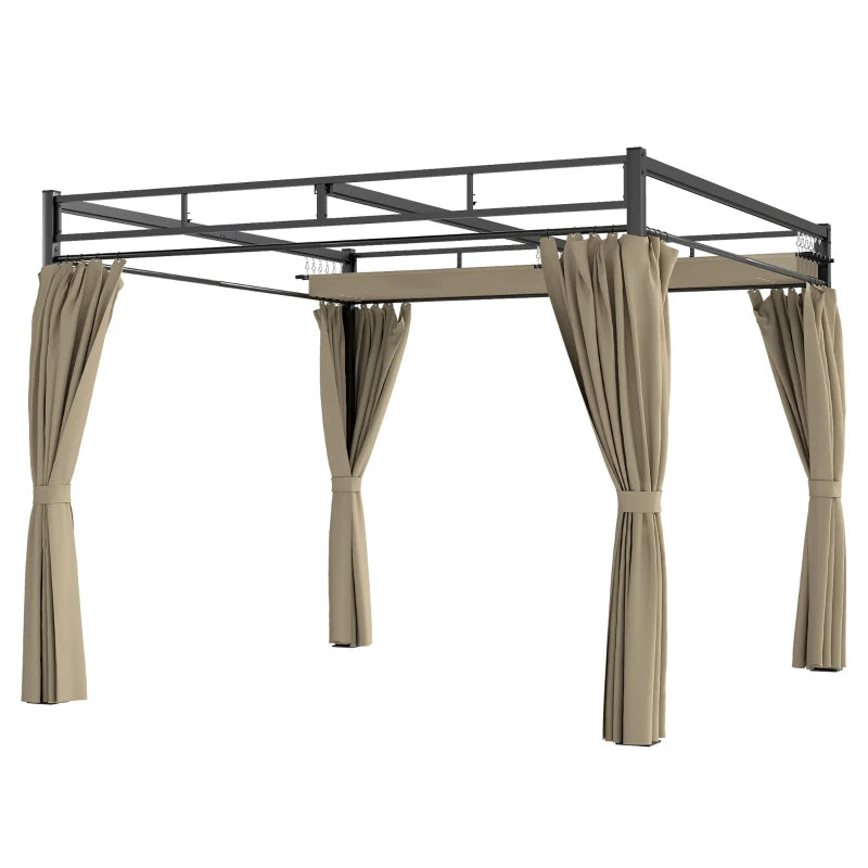 Outsunny 3 x 3 m Pergola with Retractable Roof Canopy and Curtains, UPF30+ Metal Frame Garden Pergola Gazebo Sun Shade, Khaki