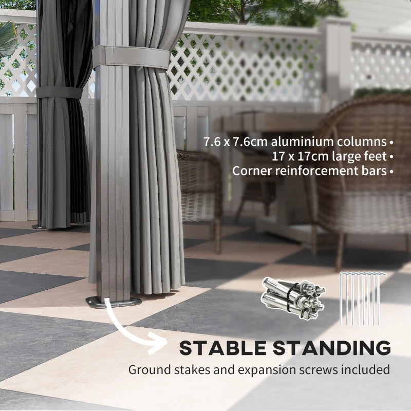Transform your garden into a haven with the Outsunny polycarbonate gazebo. Featuring 6mm thick polycarbonate panels, this waterproof gazebo shields you from UV rays while keeping you cool with its clever two-tier airflow design. Stop the sun at any angle and get rid of unwanted winged guests with curtains and nettings. Enjoy a serene outdoor shelter with sides, great as a heavy-duty, permanent fixture for any patio.