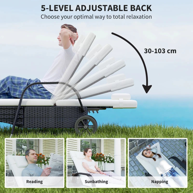 Outsunny 5PC PE Rattan Sun Lounger, Outdoor Wicker 5-level Adjustable Recliner Sofa Bed with Storage Side Table and Footstools, for Patio, Garden, Poolside, Black