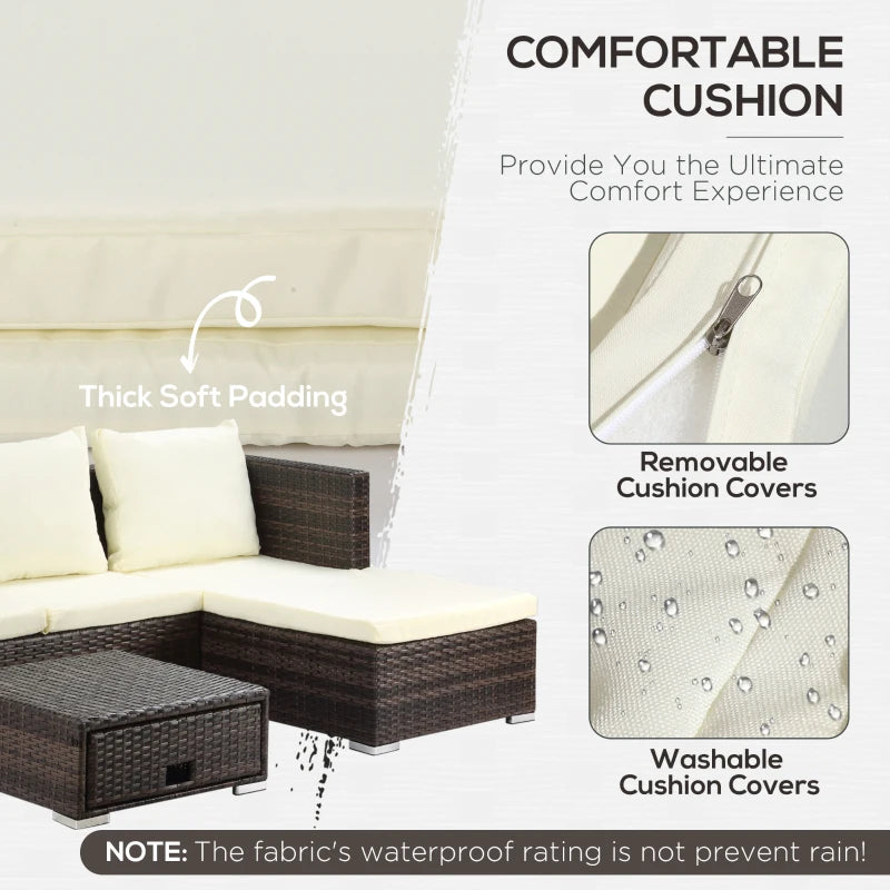 Outsunny 3 Pieces Rattan Garden Furniture Sofa Set, 4 Seater Garden Corner Sofa with 5-Level Reclining Sun Lounger and Storage Coffee Table, Outdoor Furniture Conservatory Set with Cushions, Brown