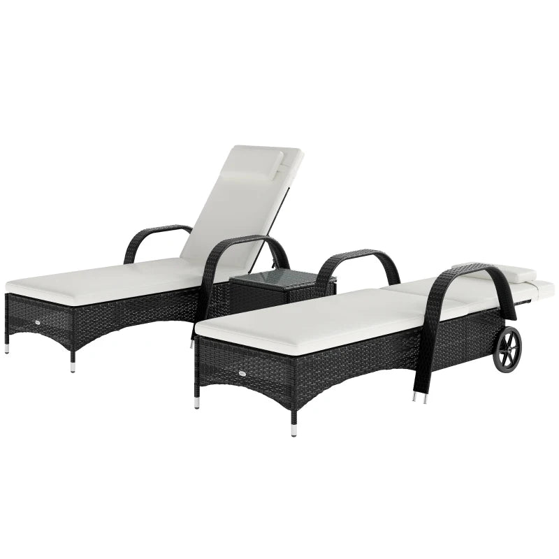 Outsunny 3 Pieces Rattan Sun Loungers, Garden Wicker Wheeling Recliner , PE Rattan Lounge Chairs w/ Cushions & Side Coffee Table Grey