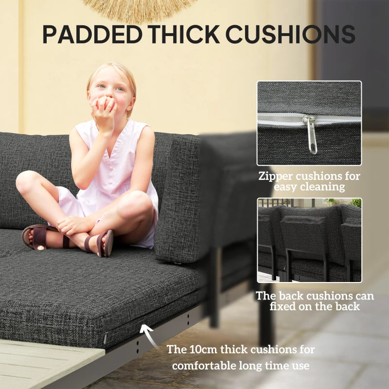 Outsunny 3 Pieces Garden Furniture Set, Aluminium 4 Seater Corner Sofa Set with 2 Loveseats, Coffee Table and Side Trays, Outdoor Conversation Furniture with Cushions for Garden, Dark Grey