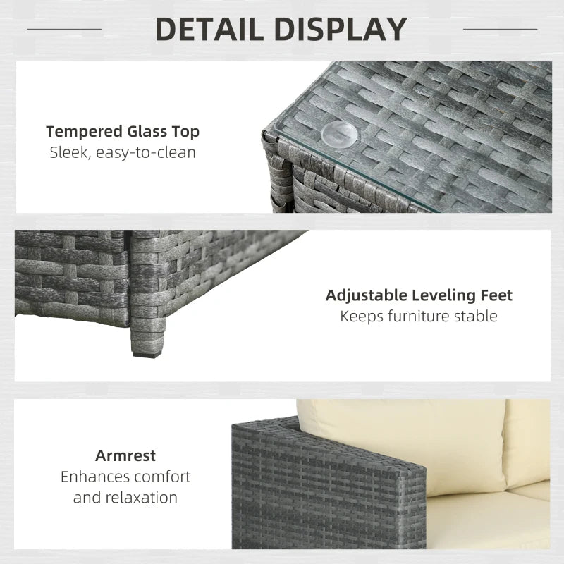 Outsunny 3 Pieces PE Rattan Garden Furniture Set with 10 cm Thick Cushions, 4 Seater Garden Corner Sofa Set with Glass Top Coffee Table, Outdoor Furniture for Patio, Porch, Beige