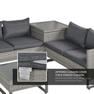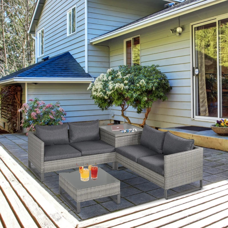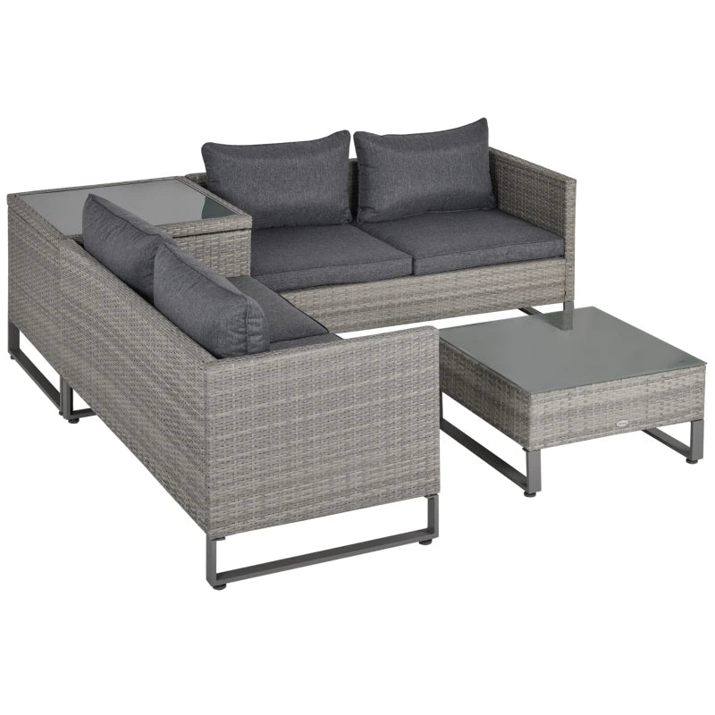 Outsunny 4 Pieces Rattan Garden Furniture Set, 4 Seater Garden Sofa Set with Storage Box, Loveseats and Glass Top Table, Wicker Outdoor Conservatory Furniture with Cushions for Outdoor, Patio, Grey