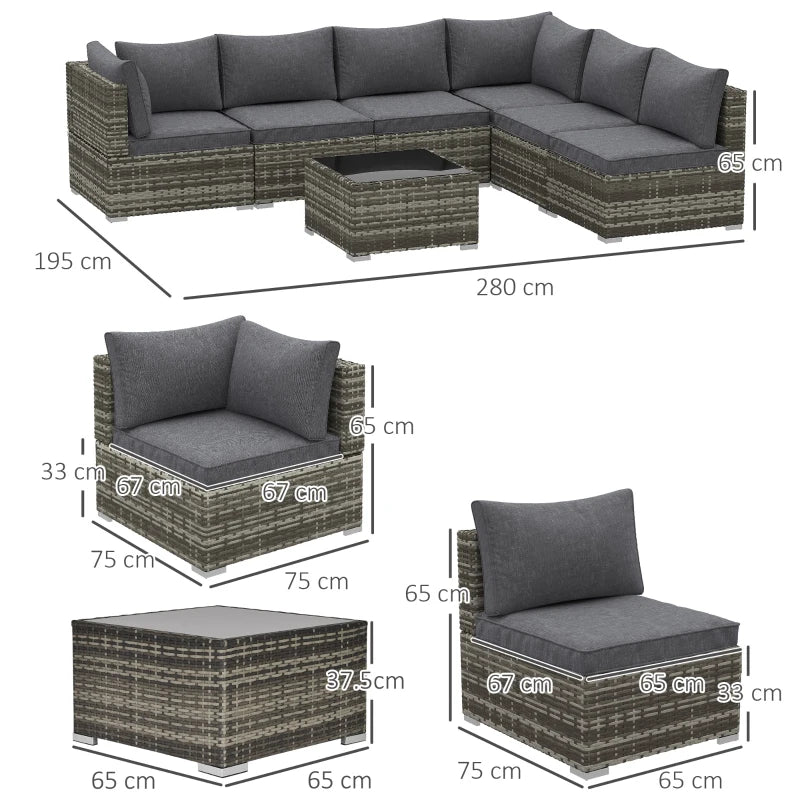 Outsunny 7 Pieces Outdoor PE Rattan Corner Sofa Set, Patio Wicker Conversation Chaise Lounge Furniture w/ Tempered Glass Table-top & Soft Padded Cushion for Garden, Backyard, Lawn, Dark Grey