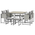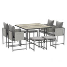 - Nine-piece garden furniture set: includes a square dining table, four armchairs and four footstools