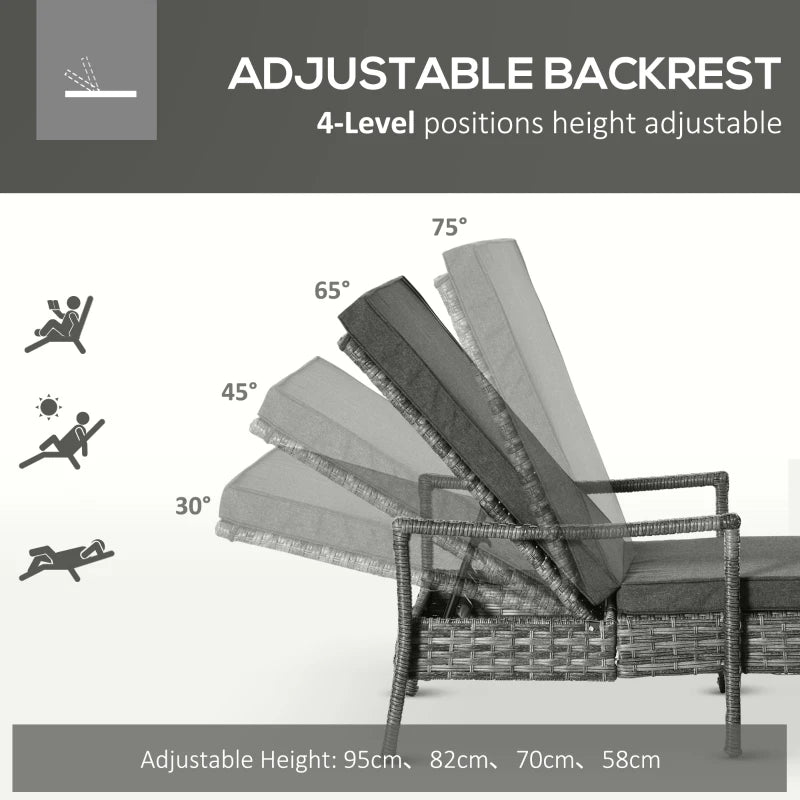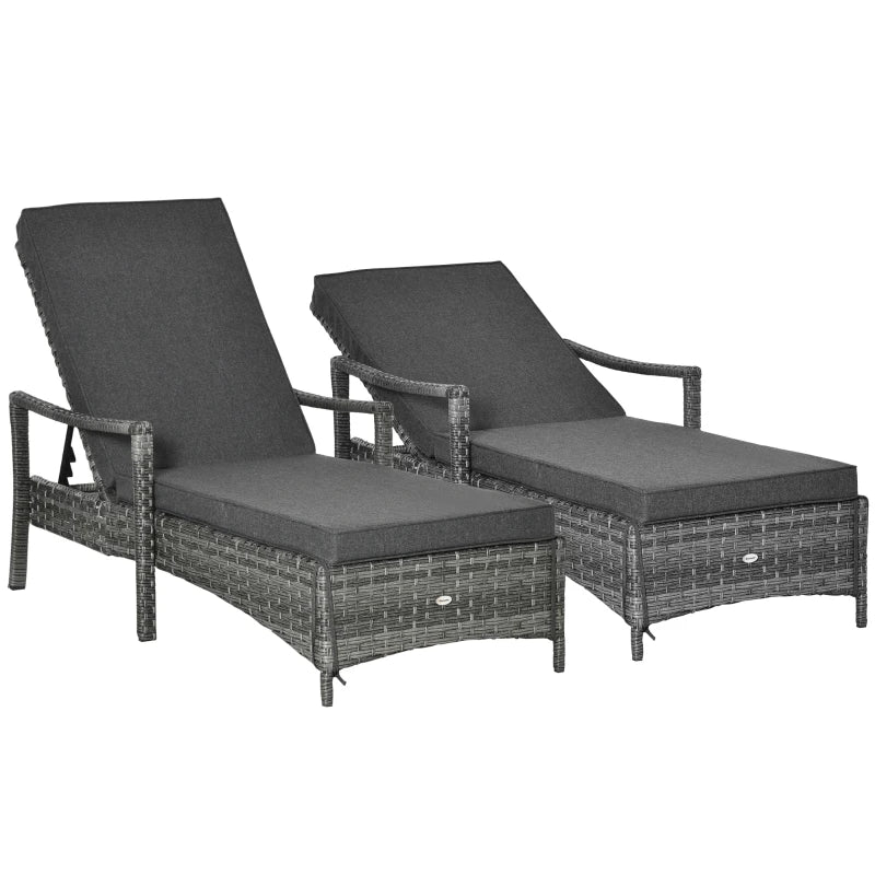 Outsunny PE Rattan Sun Loungers set of 2 with Cushion, Outdoor 2 Pieces Garden Sunbed Furniture with 4-Level Recliner Backrest, and Armrest, Grey