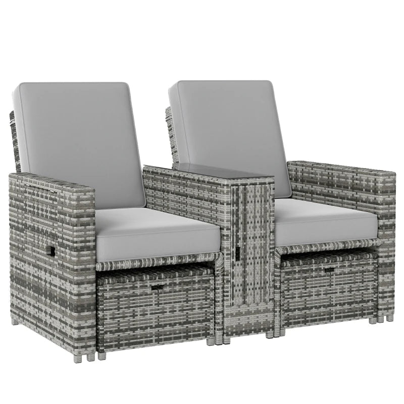 This Outsunny set combines reclining garden furniture, with storage and most importantly, somewhere to relax with a friend. It comes with two reclining chairs, two storage footstools and a tempered glass-top table. Both chairs feature a reclining back: set to five different angles so you can relax the way you want to. A steel frame forms each piece for strong support, wrapped in stylish plastic rattan: a garden-ready look to be used this season and beyond.