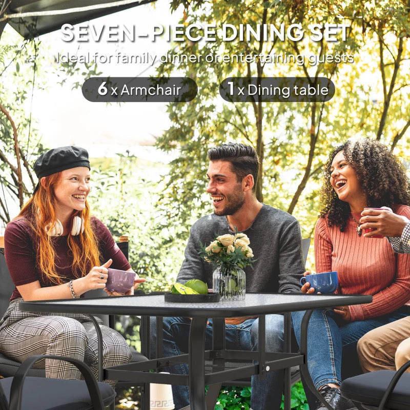 Enjoy your socialising time outdoors comfortably - look to this garden table and chairs set from Outsunny. Comes with six padded armchairs and a tempered glass-top table. Steel frames make each piece strong. High backs and armrests on the chairs for support, with a padded seat for comfort. The table is fitted with a tempered glass tabletop - comes with a middle hole to hold a parasol umbrella in place (Ф38 mm sized pole).