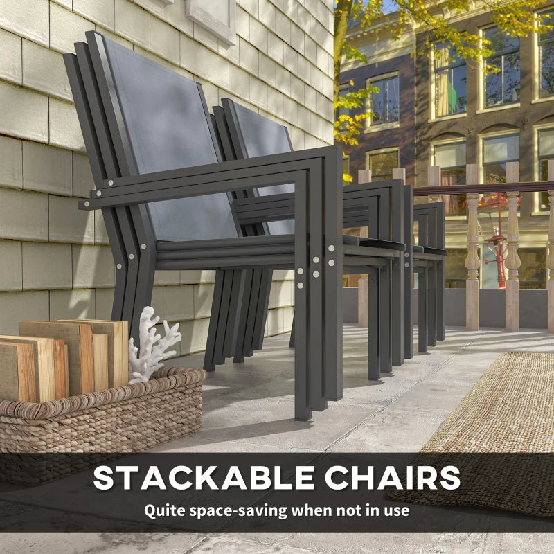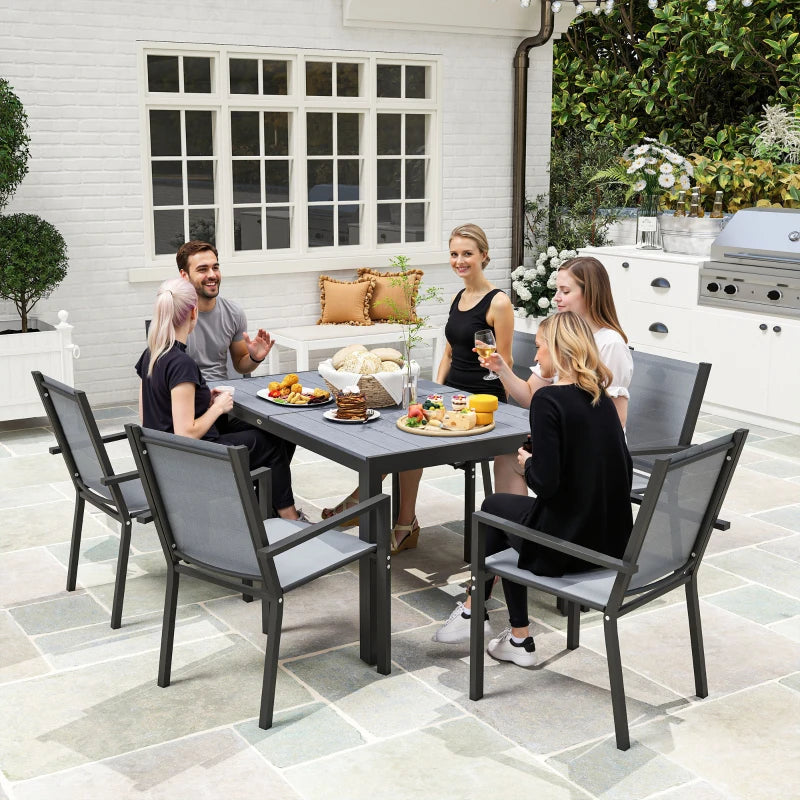Whether it's for breakfast, brunch or dinner, this Outsunny seven-piece garden dining set brings everyone together. Six stackable chairs to sit with your favourite people, with the large table giving plenty of dining room. Made from plastic wood composite board, the tabletop is strong and low-maintenance. Our garden table and chairs are suitable for outdoor use: the teak-effect design is an excellent addition to outdoor spaces.