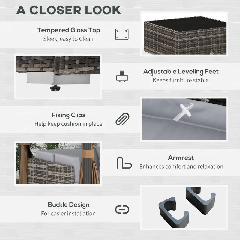 Bring beauty and comfort into your garden with Outsunny patio set. The steel frame of each piece means a strong, supportive structure; wrapped in PE wicker, the rattan top offers extra protection and style. Padded seat and back cushions provide comfort, with two extra pillows included. The rattan corner sofa is easy to assemble, with the buckle fastenings keeping all pieces secure. Set is completed with a safe tempered glass top on the table for a sleek look.