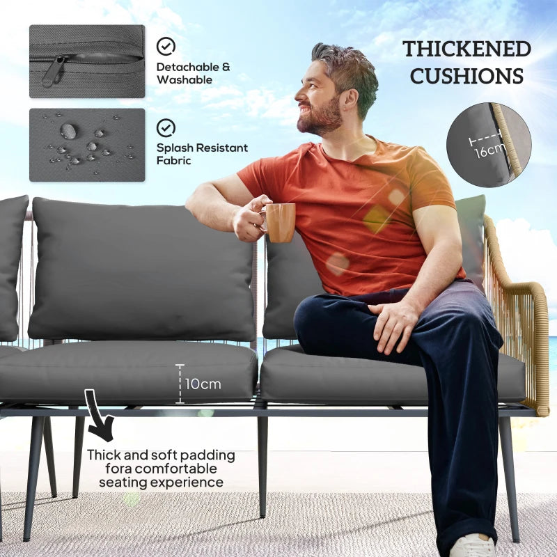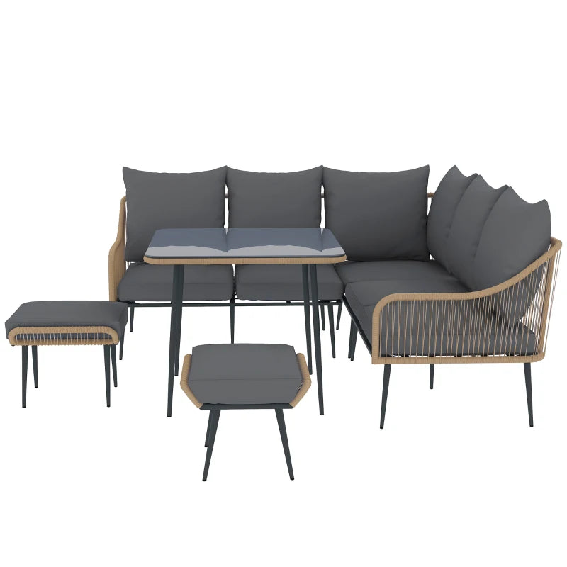 Simple and sleek, finished with total comfort - this Outsunny garden sofa set ticks all the right boxes. The outdoor furniture set comes with six pieces: two loveseats, a corner chair, two footstools and a square table. Steel frames mean a strong core, with the rattan string panels adding a delicate style. The thickened padded cushions on the seats and back of this garden lounge set allow you to relax comfortably. The glass tabletop adds a sleek finishing touch.