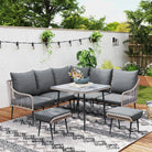 - Six-piece balcony furniture set: two loveseats, a corner seat, two footstools and a table